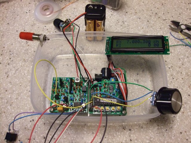RXとDDS-VFOですが電源を単三電池4本から6本に変えたところ(RXにはDDS-VFOの三端子レギュレータからの5Vを使用)、「ブーン」と鳴っていたハム音が治まりようやくクリアに聞けるようになりました。