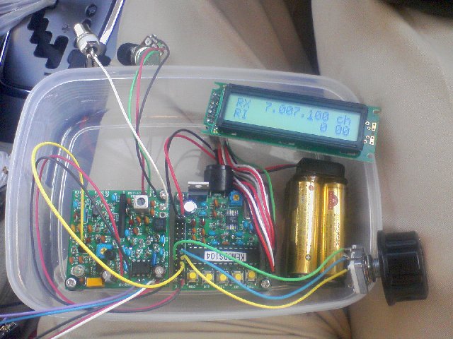 ケースに仮組みの7MHz受信機とデジタルVFO(KEM-RX7 & KEM-DDS-VFO-MC50)も持ち出し、10m釣竿にリード線をくくりつけたアンテナもどき(チュナー無し)に接続。