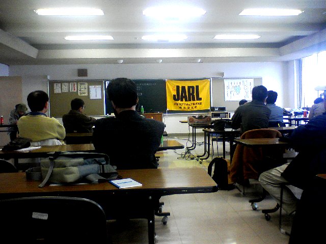 で、驚いたのは参加者の年齢層の高さ!20代はもう期待できないだろうが同じ30代位の人も見当たらない。というかオレが参加者で一番若い!アマチュア無線の衰退というのは、若い人が全然入ってこないということを改めて実感。ということでお邪魔にならないよう一番後ろに席を取る。